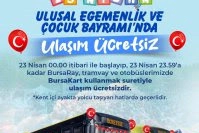 Bursa Büyükşehir Belediyesi, 23 Nisan Ulusal Egemenlik ve Çocuk Bayramı kutlama ve etkinliklerinin coşkulu kalabalıklarla yapılabilmesi için kent içinde ayakta yolcu taşıyan BursaRay, tramvay ve otobüs hatlarının 23 Nisan günü 00.00 ile 23.59 saatleri arasında BursaKart kullanmak suretiyle ücretsiz olarak hizmet vereceğini açıkladı.