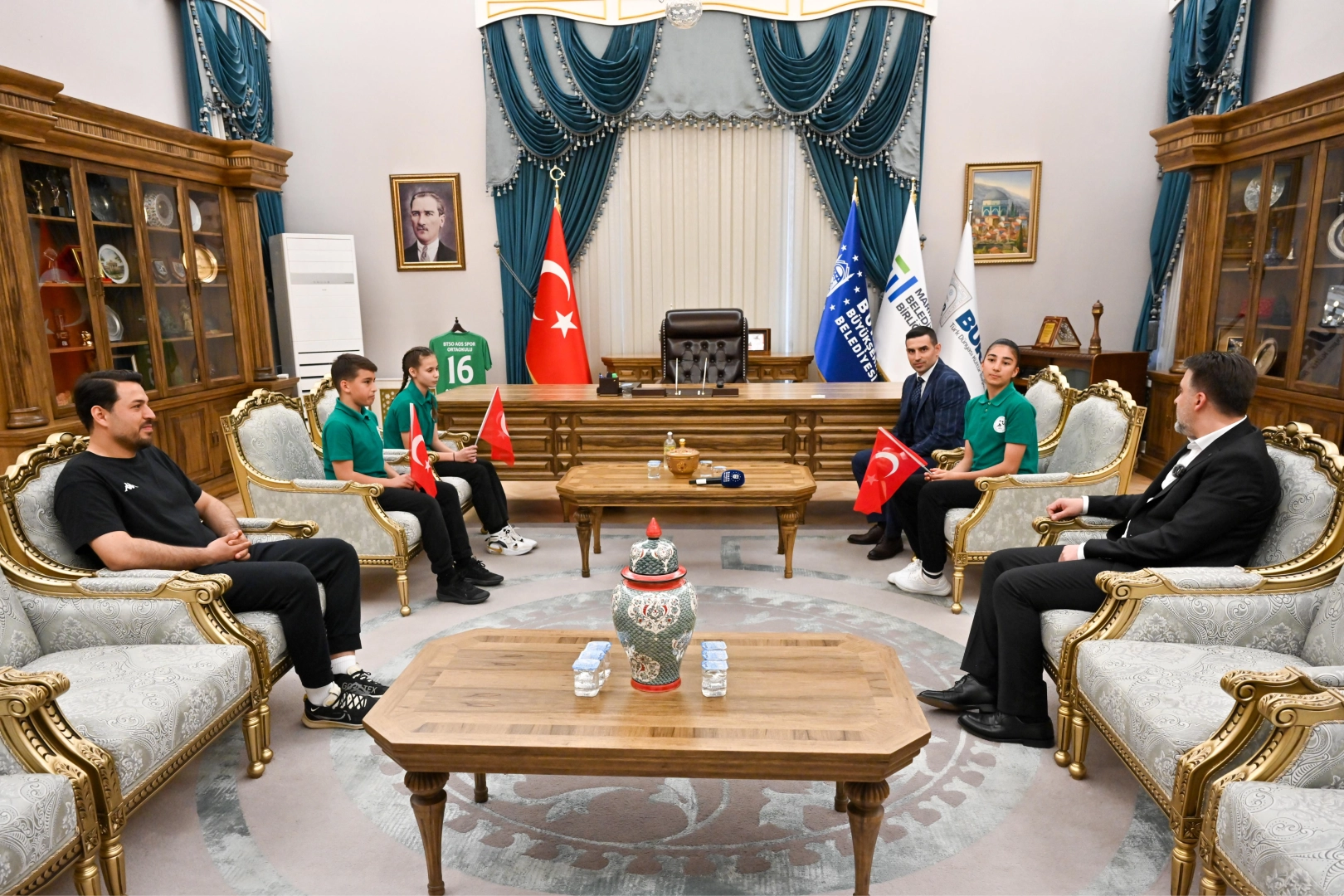 Bursa Büyükşehir Belediye Başkan Vekili Şahin Biba da koltuğunu BTSO Ali Osman Sönmez Spor Ortaokulu öğrencileri Ömer Akif Avcı, Gökçe Betül Sevinç ve Lina Ravalı’ya devretti. Bursa Büyükşehir Belediyesi Tarihi Binası’nda düzenlenen devir teslim töreninde, geleceğin başkanlarına okul müdürü Selahattin Özkan ve sınıf öğretmeni Ömer Akgül eşlik etti.