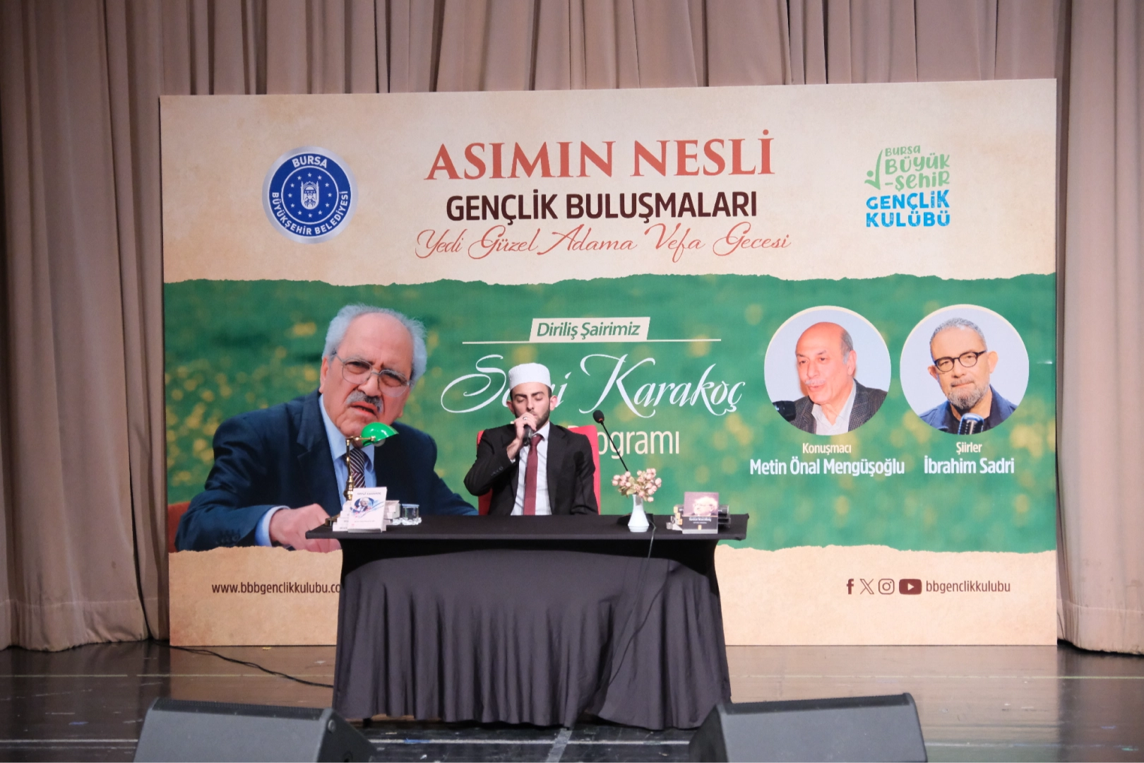 Bursa Büyükşehir Belediyesi’nin periyodik olarak düzenlediği “Asım’ın Nesli Gençlik Buluşmaları” projesi kapsamında 7 Güzel Adam’a Vefa Gecesi programının bu ayki konusu merhum ‘Diriliş Şairi’ Sezai Karakoç oldu. Şair İbrahim Sadri ve Metin Önal Mengüşoğlu’nun üstadın fikirlerini ve şiirlerini konuştuğu etkinliğe Büyükşehir Belediyesi Başkanvekili Fethi Yıldız ve çok sayıda genç katıldı.