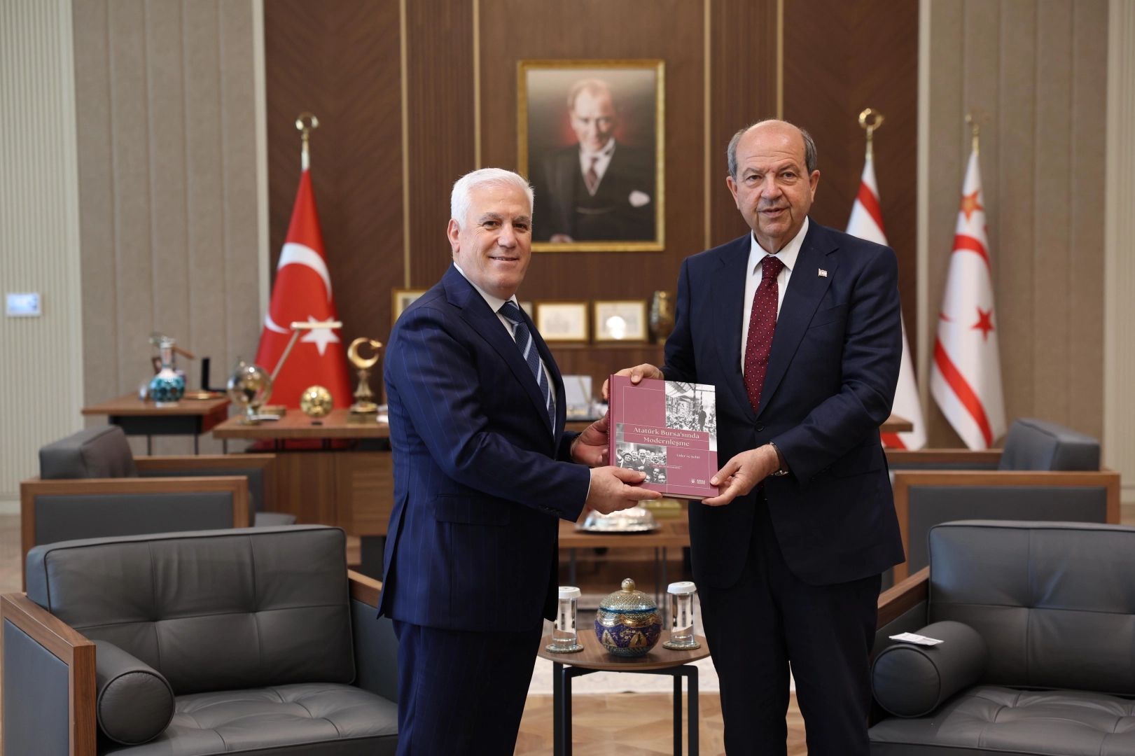 Cumhurbaşkanı Ersin Tatar’a Bursaspor forması ve ‘Atatürk Bursa'sında Modernleşme’ kitabını hediye eden Başkan Bozbey, “Görüşmemizde, Bursa ile KKTC arasındaki ikili ilişkilerin güçlendirilmesi, direkt uçuşların artarak devam etmesi, kültürel ve ekonomik iş birliklerinin artırılması konularını ele aldık. Kıbrıs Türklerinin menfaatlerini her zaman koruyacağımızı bir kez daha vurguluyorum. Cumhurbaşkanı Ersin Tatar’a ev sahipliği için teşekkür ediyorum” dedi.