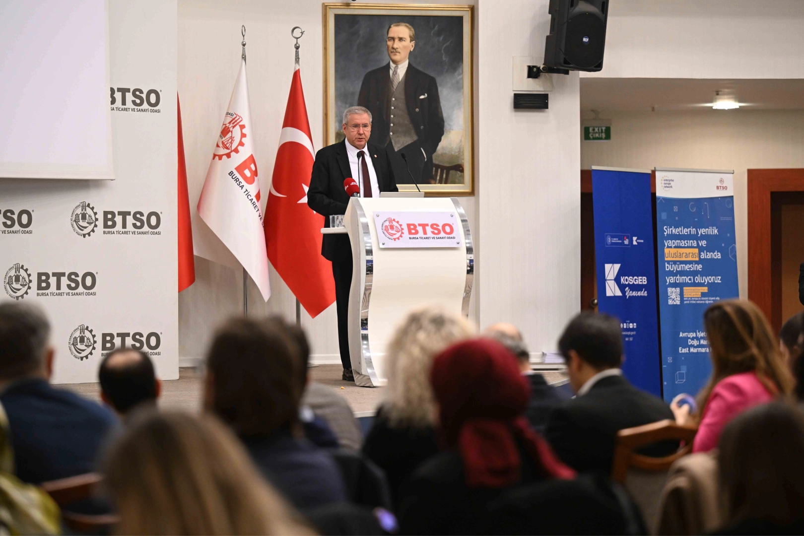 Bursa iş dünyasının dijital dönüşüm süreçlerine katkı sağlamak, KOBİ’lerin ulusal ve uluslararası destek mekanizmalarına erişimini artırmak ve yeni iş birliklerinin geliştirilmesine zemin hazırlamak amacıyla “Dijital Dönüşüm ve Uluslararası İş Birliği Fırsatları” etkinliği BTSO Ana Hizmet Binası’nda düzenlendi. Avrupa İşletmeler Ağı kapsamında organize edilen; BTSO Meclis Başkan Yardımcısı Metin Şenyurt, KOSGEB Başkanı Ahmet Serdar İbrahimcioğlu ve Sanayi ve Teknoloji Bakanlığı AB ve Dış İlişkiler Genel Müdürü Ahmet Halit Hatip’in açılış konuşmalarıyla başlayan program kapsamında Sanayi ve Teknoloji Bakanlığı, TÜBİTAK ve KOSGEB temsilcileri tarafından Dijital Avrupa Programı, Avrupa Dijital İnovasyon Merkezleri, Avrupa İşletmeler Ağı, EuroHPC çağrıları, Ufuk Avrupa Programı ve ulusal dijital dönüşüm destekleri gibi önemli başlıklarda bilgilendirme sunumları yapıldı.
