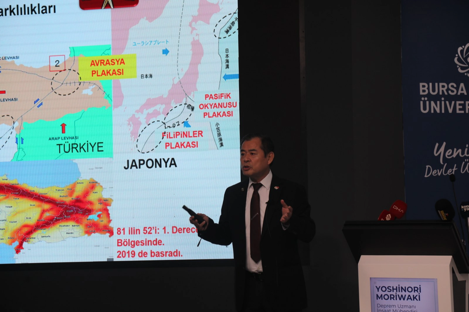 Yoshinori Moriwaki: Deprem Ölümlerinde Türkiye Dünya’da Üçüncü Sırada Açılış konuşmalarının ardından Japon Deprem Uzmanı Yoshinori Moriwaki, “İki ülkenin Deprem önleme farklılıkları” üzerine sunumunu gerçekleştirdi. Deprem konusunda Türkiye ve Japonya’yı karşılaştıran Yoshinori Moriwaki, Türkiye’de 6, Japonya’da ise 4 deprem levhasının olduğunu söyledi. Türkiye tarihinde en büyük depremin 7.9 şiddeti ile Erzincan depremi olduğunu belirten Moriwaki, Japonya’da ise 9 şiddetini gören depremin yaşandığını söyledi. Buna karşın Türkiye’nin depremde hayatını kaybedenler sıralamasında dünyada üçüncü, Japonya’nın ise yedinci olduğunun altını çizen Moriwaki, önemli olanın depremin şiddetinin değil yapıların sağlamlığı olduğunu belirtti.