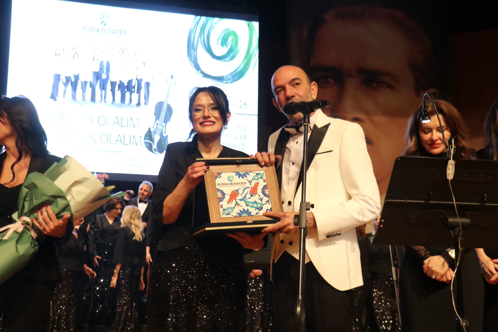 “İşte bu yüzden Bursa BUSADER olarak bizler, ‘Size ses olalım, size can olalım’ diye yola çıktık. Yakın zamanda ebediyete intikal eden, Türk müziğinin duayen sanatçılarının eserlerinden oluşan bir vefa konseri fikrinin mimarı BUSADER Federasyonu Başkanı Sayın Zerrin Özgüle başta olmak üzere, 7 aydır devam eden hazırlık aşamamızda daima yanımızda olan Antakya Medeniyetler Korosu Şefi Sayın Yılmaz Özfırat’a, Sayın Serdar Akgün ve Sayın Tuba Palancı hocalarımıza, provalarımız süresince bizlere ev sahipliği yapan Şahinkaya Eğitim Kurumları Yönetim Kurulu Üyesi Oğuzhan Şahinkaya’ya, bu salonun tahsislerinde bize destek olan BURFAŞ Genel Müdürlüğü’ne ve emeklerini fedakarca esirgemeyen koro komitesi başkanımız Sayın İclal Gülşen ve tüm gönüllü koristlerimize, konserin organizasyonunda görev alan yönetim kurulumuz ve sosyal komite üyesi arkadaşlarıma huzurlarınızda gönülden şükranlarımı sunuyorum. Bu gecenin geliriyle Tip-1 diyabetli gençlerimizin yaşam kalitesini artıracak insülin pompalarının ve işitme engelli çocuklarımızın hayata daha güçlü bağlanmasını sağlayacak işitme cihazlarının teminini sağlayacağız. Bu yüzden elbette değerli sponsorlarımıza ve bu akşam konserimize teşrif eden siz değerli misafirlerimize çok teşekkür ediyoruz. Bu sahnede yükselen her nota, aslında bir umuda dönüşecek. Bu gece burada sadece bir konser dinlemiyoruz. Bir çocuğun ilk sesini duymasına, bir gencin hayata daha güçlü tutunmasına vesile oluyoruz” ifadelerini kullandı.