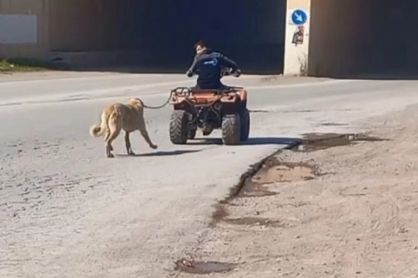 Bursa'da bir kişi, sahibi olduğu köpeği ATV'ye bağlayıp sürükledi. O anlar, bir vatandaş tarafından cep telefonu kamerasıyla kaydedildi.
