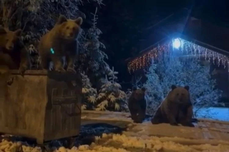 Olay, Uludağ eteklerinde gece saatlerinde meydana geldi. Yiyecek arayışına çıktığı tahmin edilen anne ayı ve yavruları, bir süre çöp konteynerini karıştırdıktan sonra ormanlık alana doğru uzaklaştı. O anlar, çevrede bulunan bir vatandaş tarafından görüntülendi.