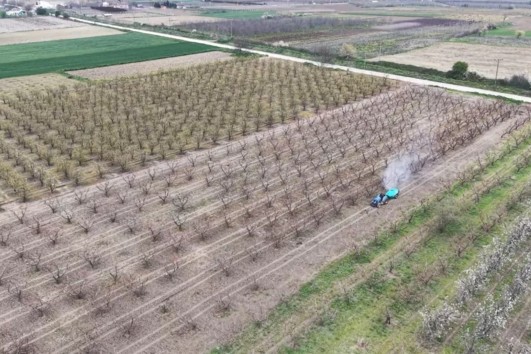 Şeftali ve armut ağaçları başta olmak üzere meyve ağaçlarında rekoltenin düşmemesi için ilaçlama çalışması yapıldı. Santa Maria cinsi armut, şeftali ve elma bahçelerindeki renk cümbüşü, dronla görüntülendi.