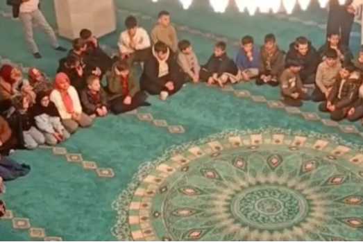 Bursa'nın Orhangazi ilçesinde Selçuklu Camii'ne aileleri ile birlikte teravih namazına giden çocuklar, namaz sonrasında ilçe Müftüsü Yasin Yıldız ile birlikte son günlerde herkesin dilinde olan "Kabede hacılar hu der Allah" ilahisini söyledi.