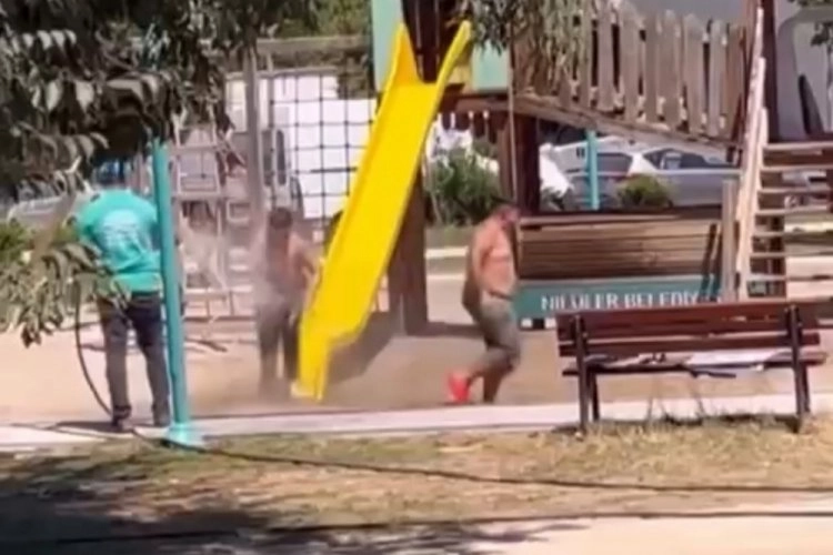 Nilüfer ilçesinde bir parktaki çimleri sulayan belediye temizlik görevlisi, sıcağa rağmen parkta oynayan çocukları görünce, onları serinletmek için elindeki hortumla su sıktı.