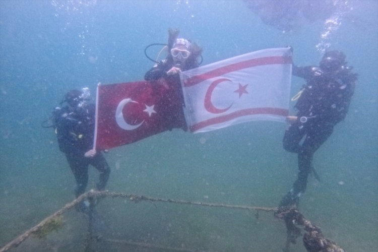 Kıyıdan açılarak yaklaşık 20 metre derinliğe ulaşan dalgıçlar su üstü ile altında Türk ve KKTC bayrakları açtı.