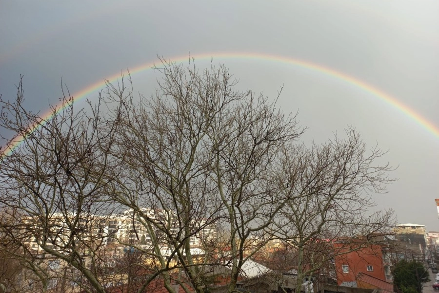 Kent merkezinde kısa süreli etkili olan sağanak sonrası güneş ışınlarının bulutların arasından süzülmesiyle gökkuşağı ortaya çıktı. Şehrin farklı bölgelerinde görülen gökkuşağı, yüksek kesimlerde daha belirgin şekilde izlenirken, vatandaşlar manzarayı cep telefonlarıyla ölümsüzleştirdi.