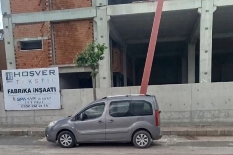 Şiddetli rüzgarın etkisiyle Kestel ilçesinde inşaattan düşen demir, park halindeki bir otomobile saplandı.