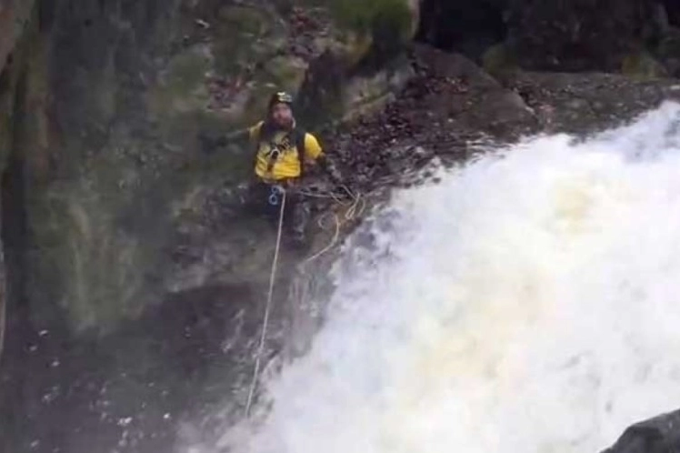 Aksiyon peşinde olan dağcı İbrahim Taşçı, büyük bir gürültüyle akan sudan soğukkanlılığı ve tecrübesi sayesinde tehlikeli bölgeden çıkmayı başardı.