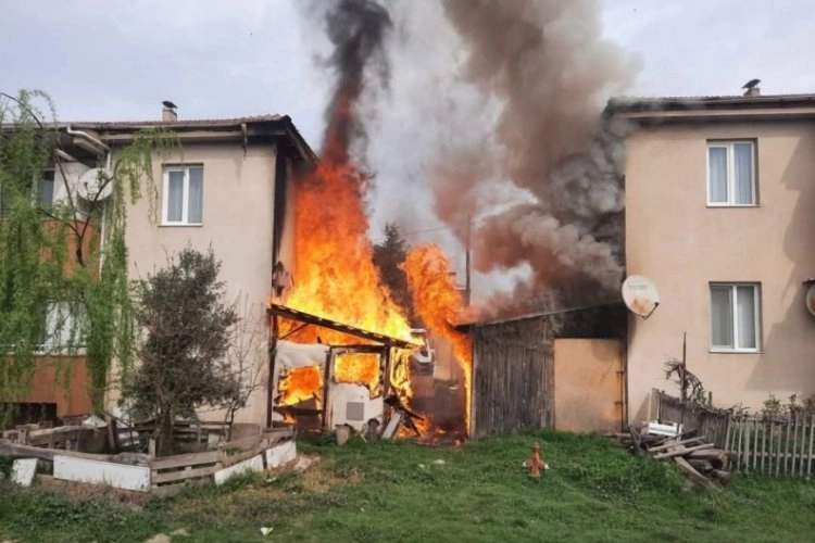 Bursa İnegöl'de meydana gelen olayda, deprem konutları içinde bulunan bir kömürlük çıkan yangın sonucu kullanılamaz hale geldi.