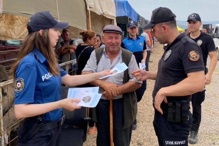 Karacabey Emniyet Müdürlüğü Asayiş Büro Amirliği ekipleri, Kurban Bayramı öncesi hayvan satışı yapılan pazara giderek esnafla buluştu. Polisler, satışa çıkardıkları hayvanlarını pazarlarken dolandırılmamaları için uyarıldı. Hırsızlık, sahte para ve tırnakçılık yöntemiyle dolandırıcılık konularında uyarılarda bulunan ekipler, esnafa Türk lirasının güvenlik özelliklerinin yer aldığı broşürler dağıttı.