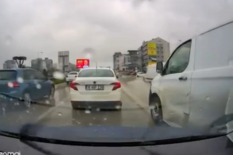 Olay, sabah saatlerinde Nilüfer ilçesinde İzmir yolu üzerinde meydana geldi. Yoğun trafik akışının olduğu caddede seyir halinde olan minibüs sürücüsü, iddiaya göre aniden bir otomobilin önüne geçmek istedi. Otomobil sürücüsünün yol vermemesi üzerine seyir halindeyken aralarında tartışma yaşandı. Bir otomobili takip edip durduran minibüsten inen 3 kişi, sürücüye hakaret edip, darbetmeye çalıştı. O anlar otomobilin araç kamerasına yansırken, polis ekipleri şüphelileri yakalamak için çalışma başlattı.