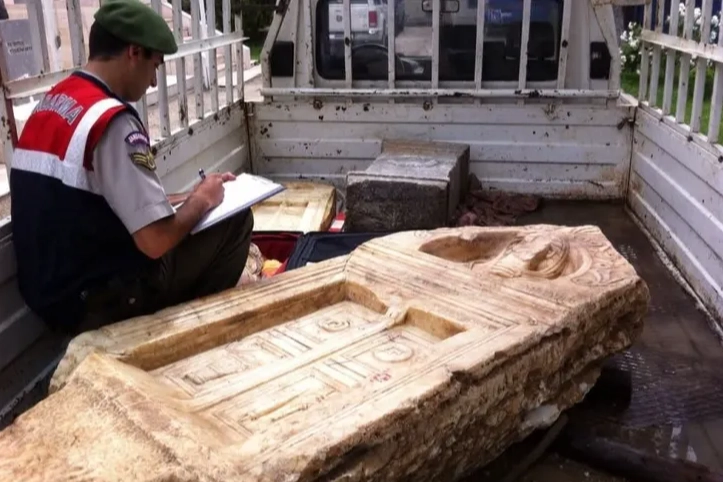 Araçta yapılan aramada brandanın altında aslan başı heykeli, Roma Dönemi’ne ait olduğu düşünülen tapınak taşı ile mezar steli ve rölyef ele geçirildi.