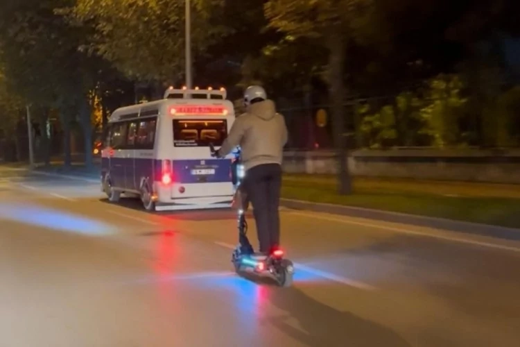 Gece saatlerinde çekilen görüntüde bir scooter sürücüsünün, orta şeridi kullanarak ana yolda araçlarla birlikte ilerlediği görüldü.