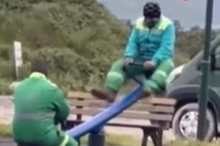 Osmangazi ilçesinde görev yapan temizlik personeli, çalışma sırasında parkta bulunan tahterevalliye binerek kısa süreli eğlendi.