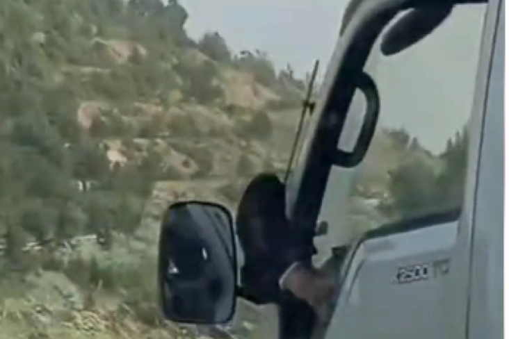 Eski çöplük mevkiinde kasasında eşya taşıyan bir araç sürücüsü, ayağını camdan çıkararak trafikte ilerledi.