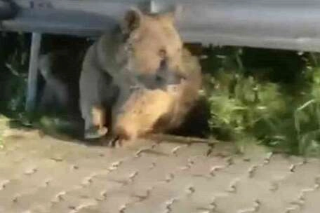 Bursa'nın Zeyniler köyünde Uludağ yolu üzerinde görülen ayının hareket halindeki araçları görünce yavrularını korumak için bariyerlerin arkasına geçtiği görüldü.