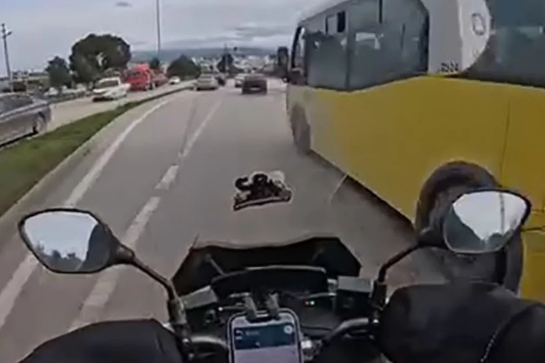 Kendi şeridinde ilerleyen motosiklet sürücüsünün önüne bir anda otobüs kırdı.