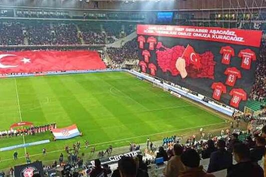 Bursa Büyükşehir Stadyumu kale arkası tribünde açılan koreografi depremden etkilenen illerin plaka kodlarının olduğu formalar yer aldı.