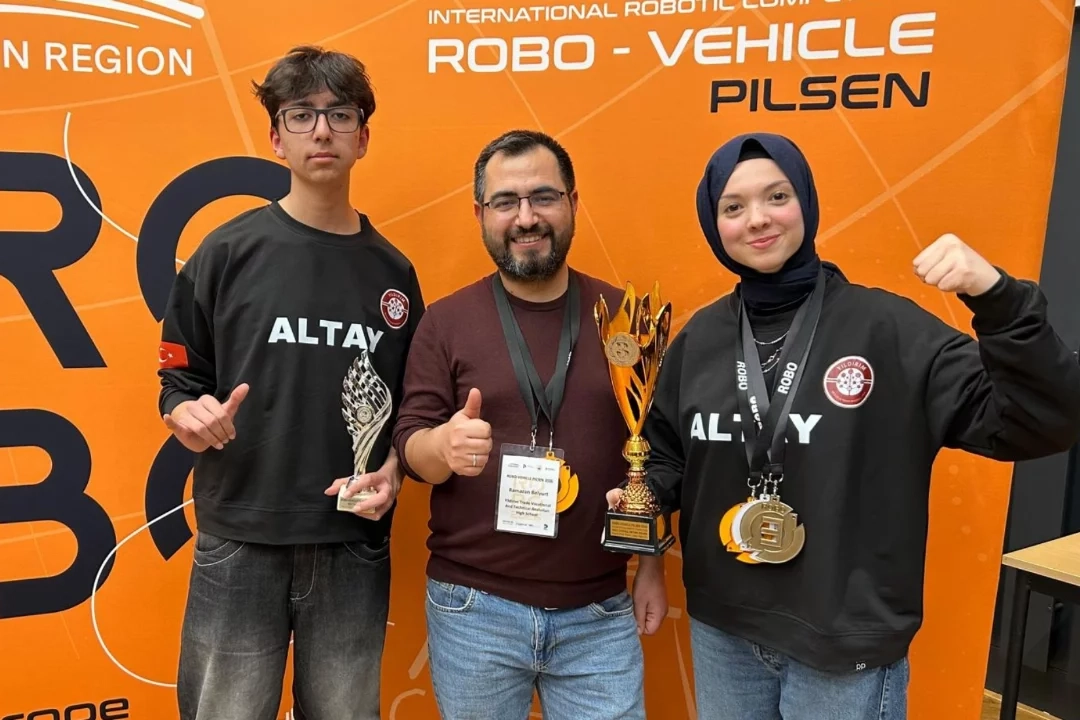 Yıldırım Ticaret Mesleki ve Teknik Anadolu Lisesi 11'inci sınıf öğrencileri Saltukcan Özgünal ve Ecrin Gülser, öğretmenleri Ramazan Belyurt rehberliğinde 3 ay üzerinde çalışma yapıp, 'Altay' ismini verdikleri otonom robotu üretti. Bursa'daki yarışmada elemeleri geçerek birinci olan öğrenciler, Çekya'nın Pilsen şehrinde düzenlenen robot yarışmasına gitmeye hak kazandı. 8 ülkeden 28 takım 56 öğrencinin projeleriyle geldikleri, 'RoboPlzen 2026 Uluslararası Robot Yarışması'na katılan Özgünal ve Gülser, üretip 'Altay' ismini verdikleri robot ile 'Otonom Araç Kategorisi'nde ikinci olurken, genel sıralamada ise üçüncülüğü elde etti.