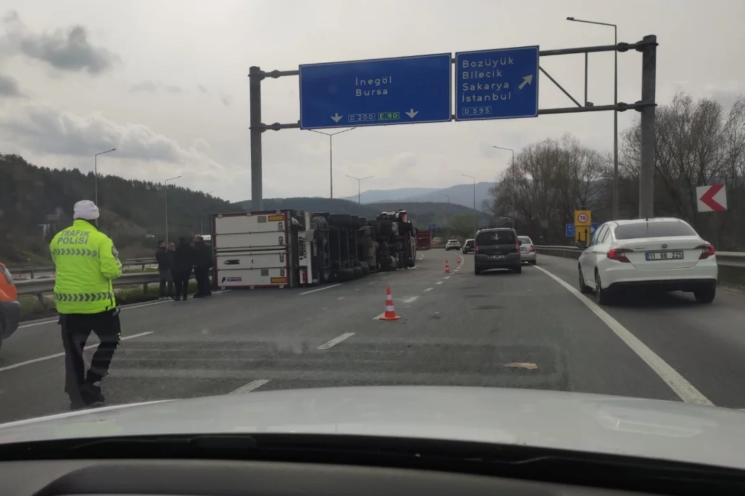 Edinilen bilgilere göre, Bursa İnegöl istikametinde, halinde bulunan tır, sürücüsünün bir anlık direksiyon hakimiyetini kaybetmesi sonucu kontrolden çıkarak devrildi. İhbar üzerine olay yerine polis ekipleri sevk edilirken, bölgede güvenlik önlemleri alındı. Devrilen tır, olay yerine çağrılan üç vinç yardımıyla bulunduğu yerden kaldırıldı. Öte yandan, kaza nedeniyle bölgede trafik bir süre aksarken, çalışmaların tamamlanmasının ardından ulaşım normale döndü.