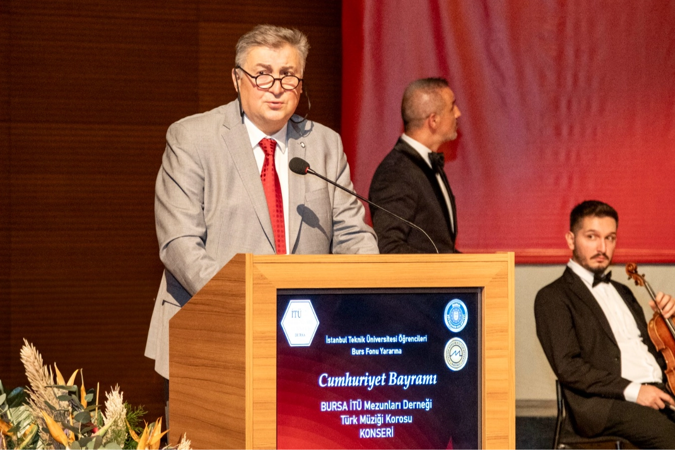 Gecenin açılış konuşmasını yapan Bursa İTÜ Mezunları Derneği Başkanı Hasan Tuğcu, tüm konuklara katılımlarından dolayı teşekkür ederek Cumhuriyetin 102. yılını kutladı. Cumhuriyetin kuruluş mücadelesinin önemine dikkat çeken Tuğcu “Milletimiz, 200 yıllık acı dolu geri çekilmesinin sonunda eşi benzeri görülmemiş bir zafere imza atmıştır. Cumhuriyet, ekonomisi ve kurumları çökmüş, aydınlarını ve gençlerini kaybetmiş bir memleket üzerine bir umut olarak kurulmuş, kimsesizlerin kimsesi olmuştur.” dedi.