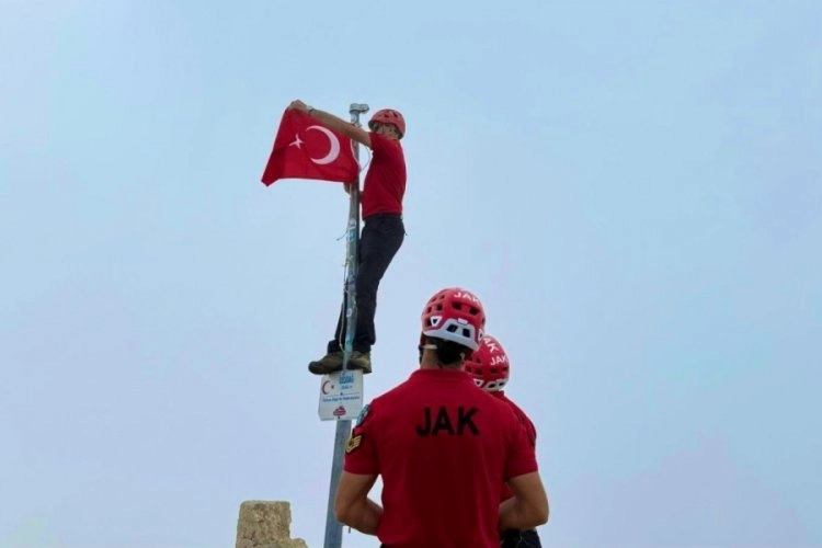Zirveye ulaşan kahraman JAK Timleri, burada bayrak değişimi yaparak Jandarma Genel Komutanlığı'nın köklü tarihine ve bugünkü görev bilincine vurgu yaptı.