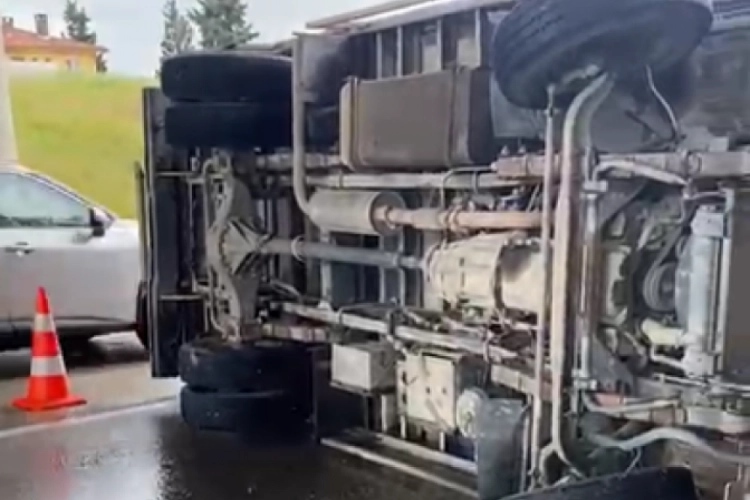 Kamyon, diğer kamyonu sollarken yakın geçmesi sebebiyle kasasına takılıp devrildi.