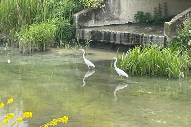 Bursa'nın Nilüfer ilçesi merkezinden geçen Nilüfer Çayı'nda beslenen iki büyük ak balıkçıl, beslenirken görüntülendi.