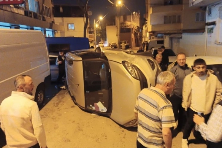 Çarpmanın etkisiyle araç yan dönerken, içerde bulunan yolculardan biri yaralandı.