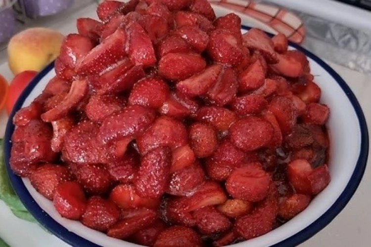 Tencereye aldığınız doğranmış çileklerin üzerine toz şekeri yayarak ilave edin. Suyunu salması için kapağını kapatın ve en az 2-3 saat bekletin.