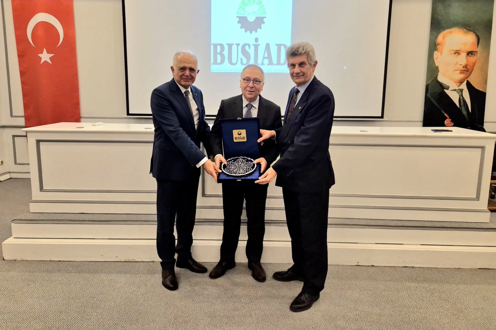 Seçimin ardından yeni BUSİAD YDK Başkanı Buğra Küçükkayalar ile BUSİAD Yönetim Kurulu Başkanı Tuncer Hatunoğlu, Ergun Hadi Türkay’a anı tabağı hediye ettiler.