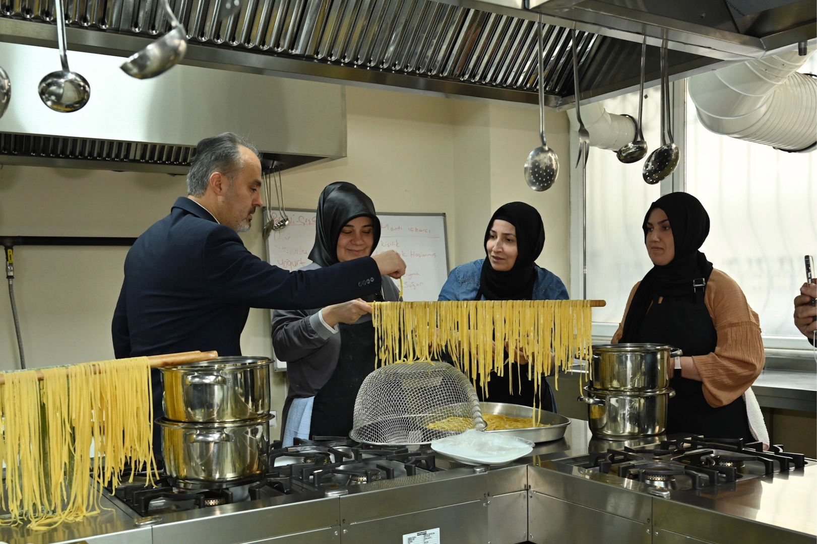Program sonunda eğitim sınıflarını gezen Başkan Alinur Aktaş, önlük giyerek mutfaktaki hünerlerini sergiledi. Kursiyerlerle birlikte el yapımı makarna ve yaş pasta yapan Başkan Aktaş, daha sonra yaptığı ürünleri kursiyerlere ikram etti.