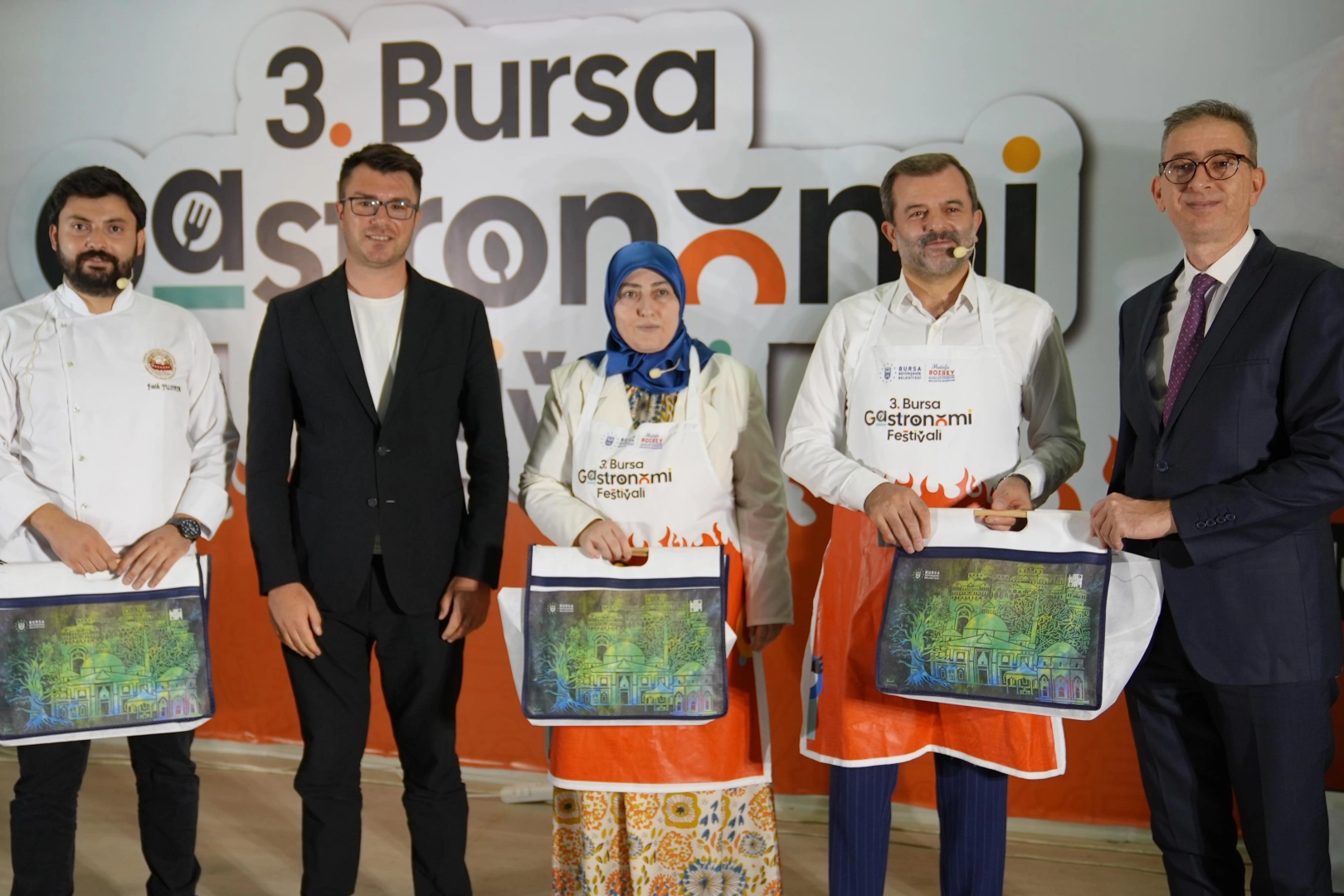 Bursa’nın lezzetlerini ilçelerle buluşturmak ve Bursalıları festivale davet etmek amacıyla Büyükşehir Belediyesi tarafından ilçelerde gezdirilen Gastronomi Tırı’nın yeni durağı Gürsu oldu. Belediye Başkanı Mustafa Işık ve Eşi Sümeyye Işık tarafından sahnede özel bir mutfakta hazırlanan menü ile Gürsu’nun lezzetleri tanıtıldı. Akademisyen Şef Fatih Yıldırım, Bursa Aşçılar Derneği Kadın Kolları Başkanı Tülay Dönmez, Eğitmen Şef Selin Sekizkardeşler ve Eğitmen Şef Aybiçe Taylak’ın yardımları ile anlatılan menüde Gürsu bamyasından bamya çorbası, hinkal ve armutlu kurabiye yapıldı.