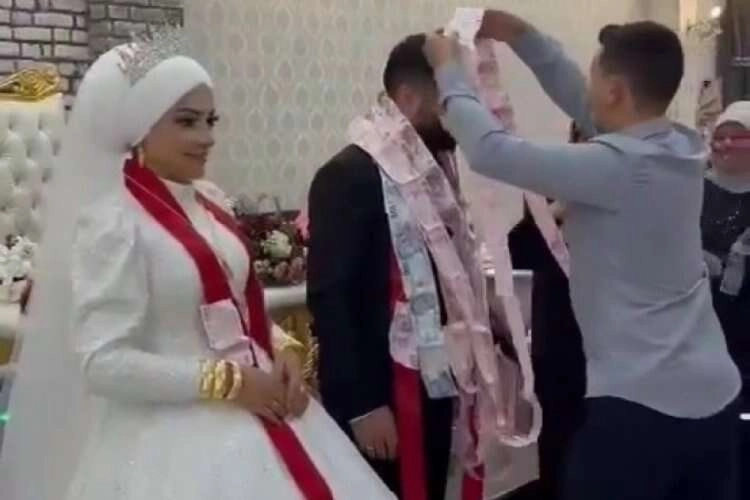 Düğün salonunun bir ucundan diğer ucuna uzayan 45 metrelik paraları gören davetliler şaşkınlıklarını gizleyemedi.