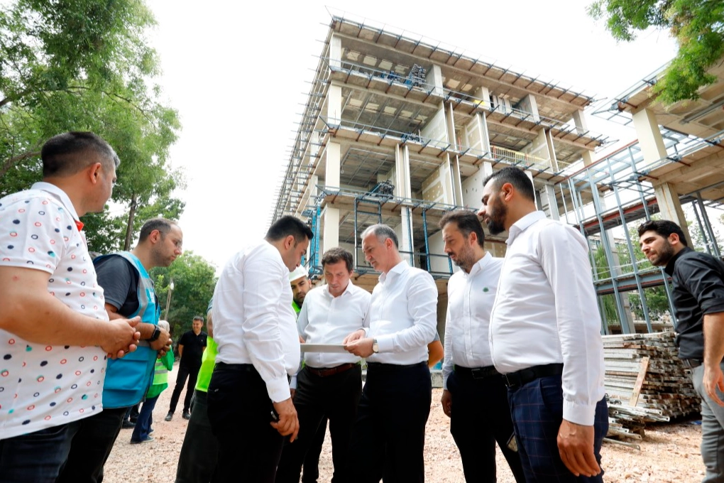 Devam eden çalışmaları yerinde inceleyip son duruma ilişkin bilgi alan Başkan Taban, “Hedefimizden şaşmadan yeni belediye hizmet binasını belirlediğimiz tarihe kadar yetiştirmek üzere müteahhit firmamız ve çalışma arkadaşlarımız çalışıyor. Bir yandan burada çalışmalar sürerken, diğer yandan meydan için de çalışmalarımız devam ediyor. Hem heykel bölgesi hem de karşı adada eski hükümet konağı, eski kaymakamlık lojmanı ve sedir kafenin bulunduğu alanda şehrimize yakışan bir meydan oluşturmak istiyoruz. 7/24 ilçe halkımıza hizmet verecek olan, içerisindeki sosyal alanlarla yaşayan bir belediye hizmet binası da bu alanın önemli parçalarından biri olacak. Burada; sergi alanları, İnegöl’ümüzün lezzetlerinin yer aldığı Gastro İnegöl restoranı, kafeterya, gençlerimiz için alanlar ve toplantı salonları gibi vatandaşlarımızın da sürekli kullanacağı alanlar yer alıyor. Bu özelliği ile de yükselen binanın sadece bir belediye hizmet binası olmadığını ifade etmek istiyorum” dedi.