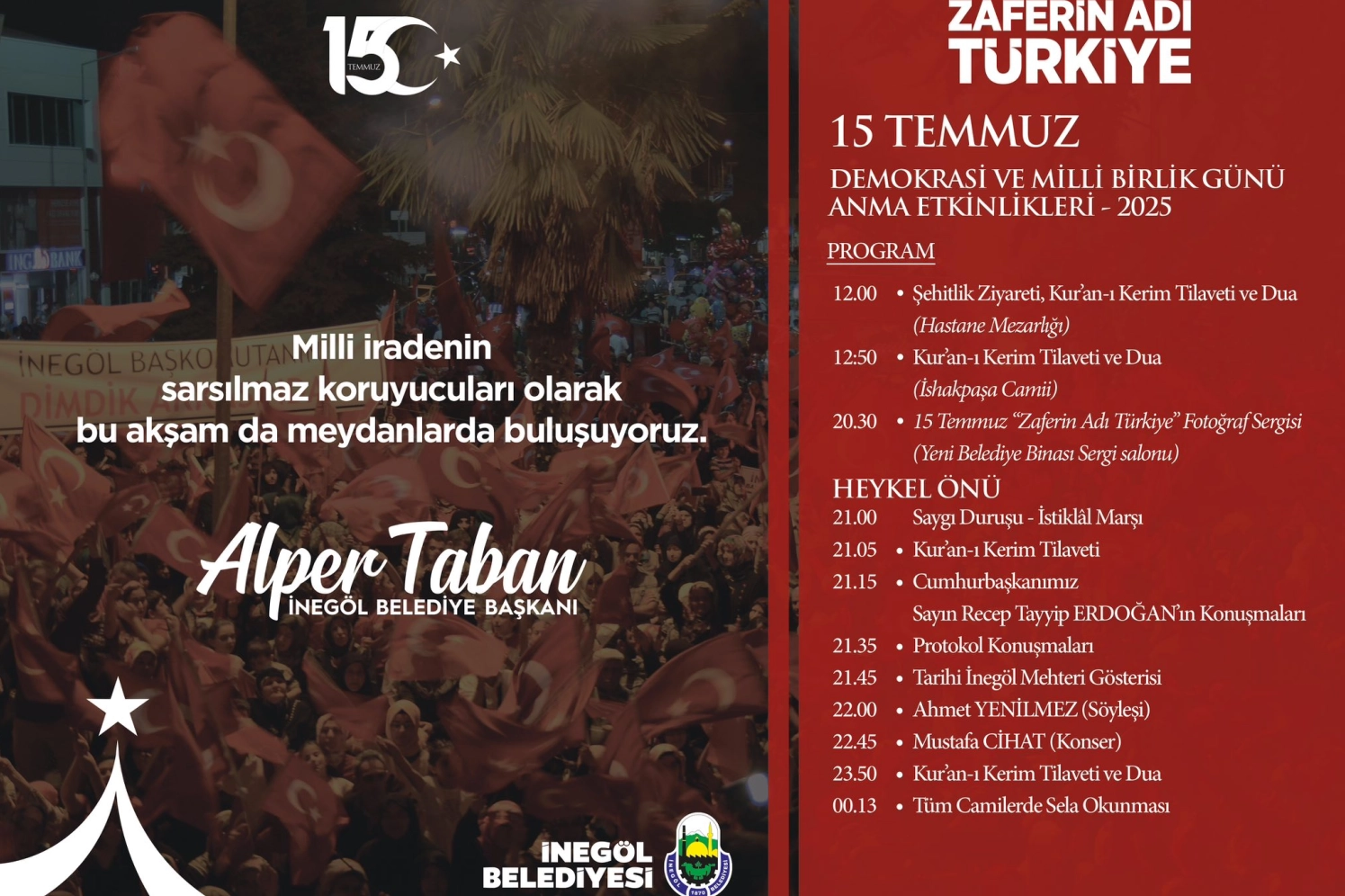 Akşam saatlerinde ise tüm İnegöllüler, Heykel Meydanı’nda buluşacak. Burada kurulacak sahnede 21.15 itibariyle Cumhurbaşkanı Recep Tayyip Erdoğan’ın konuşmaları ve İnegöl protokolünün konuşmaları ile program başlayacak. Dualar ve Kuran-ı Kerimlerin de okunacağı programda 21.45’te Tarihi İnegöl Mehteri sahne alacak. 22.00’de tiyatro sanatçısı Ahmet Yenilmez’in söyleşisiyle devam edecek etkinlikler, 22.45’te sanatçı Mustafa Cihat’ın vereceği konserle taçlanacak. Dualar ve 00.13’te okunacak salalarla program sona erecek.