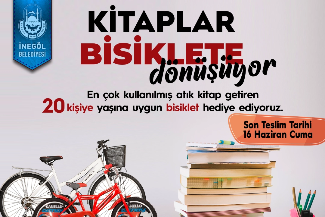 İnegöl’de bu yaz, İnegöl Belediyesi’nin “Kitaplar Bisiklete Dönüşüyor” kampanyası ile daha eğlenceli geçecek. 2022-23 eğitim öğretim yılının bitimine sayılı günler kalırken, İnegöl Belediyesi öğrencilere hem karne hediyesi olacak hem de eski kitapların geri dönüşüme kazandırılmasını sağlayacak bir kampanya başlattı. Kullanılmış ve geri dönüştürülebilecek tüm kitapları kapsayan kampanya ile en fazla kitap getiren 20 kişi, yaşına uygun bir bisikletin sahibi olacak. Kitaplar 16 Haziran Cuma günü mesai bitimine kadar İnegöl Belediyesine teslim edilebilecek.