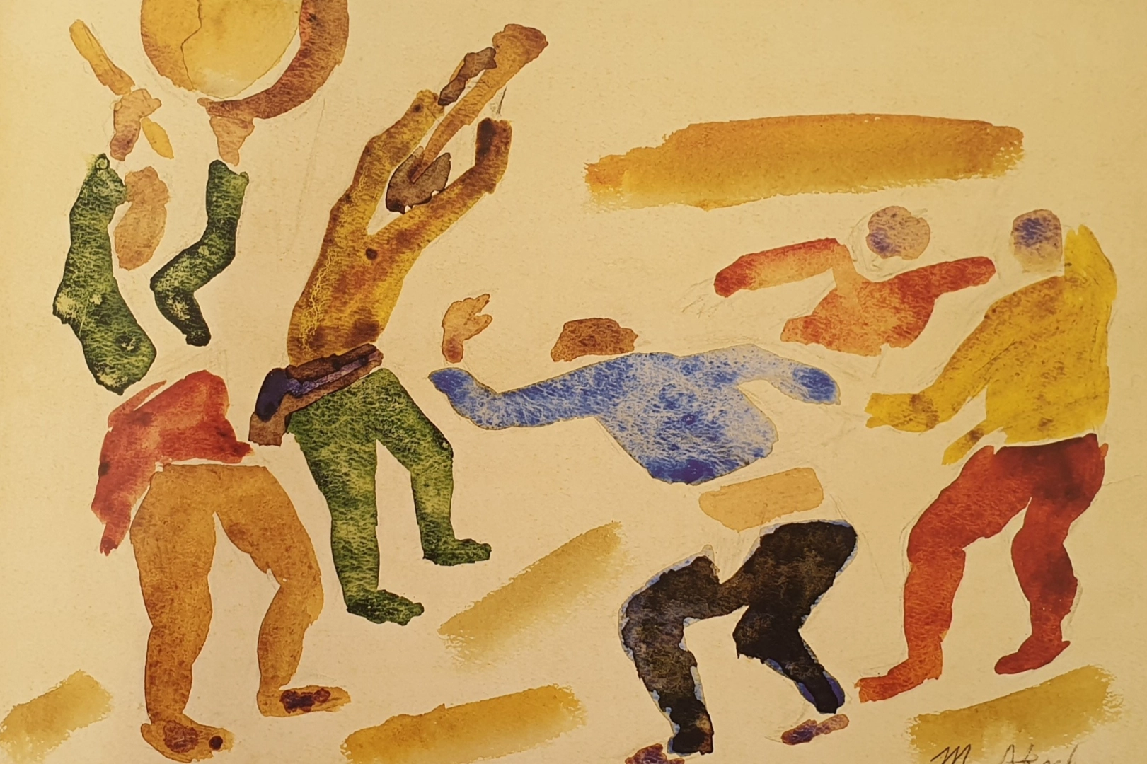Resmin sağ tarafında ise üç kişi halay çeker şekilde betimlenmiştir. Resimde mekan sarı lekelerle belirtilmiştir.