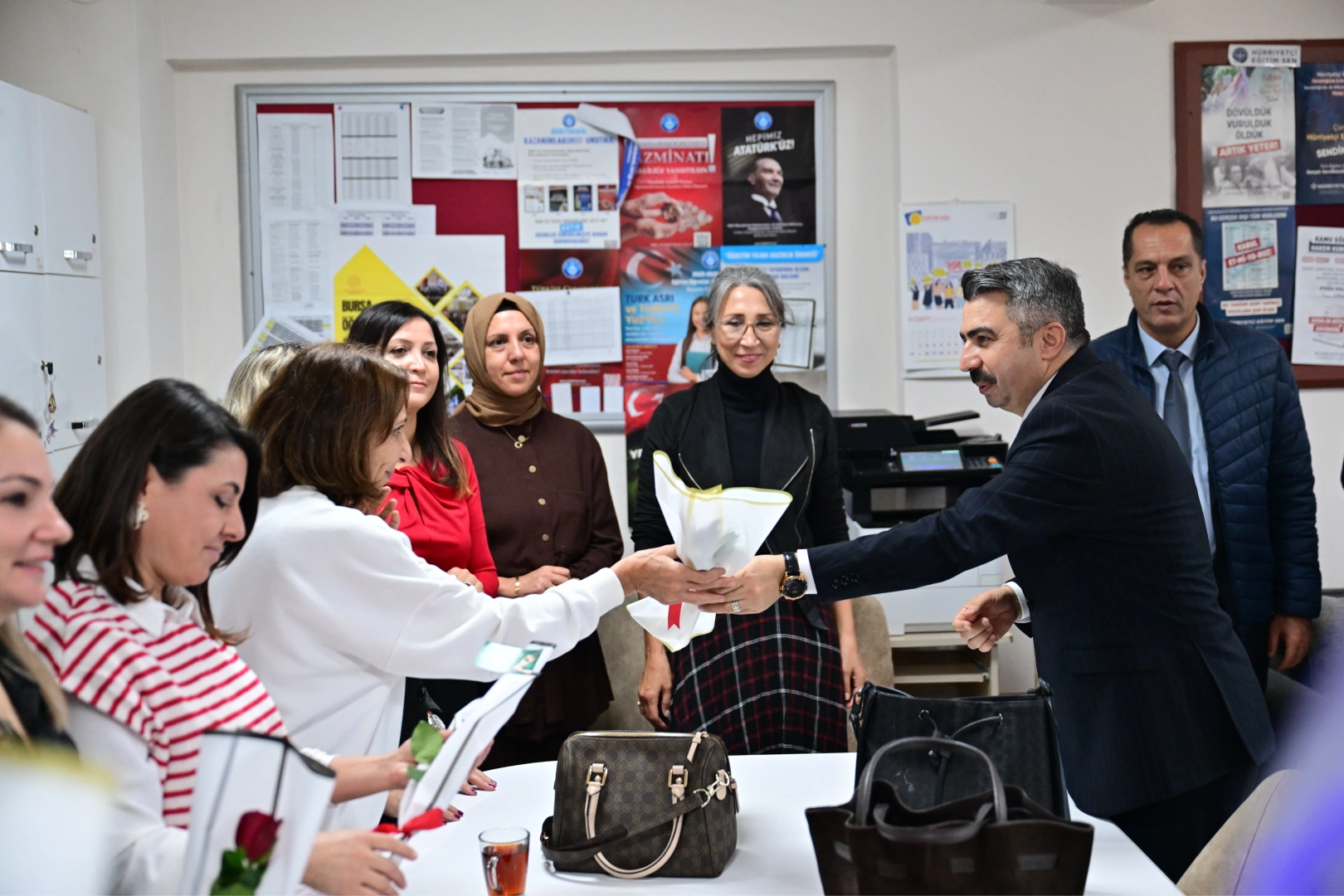 Yıldırım Belediye Başkanı Oktay Yılmaz, 24 Kasım Öğretmenler Günü’nde Yıldırım’da görev yapan öğretmenleri unutmadı. Güne, Yunus Emre İlkokulu’nda başlayan Başkan Oktay Yılmaz, 4-L sınıfını ziyaret etti. Ders başladıktan sonra, kapıyı vurarak elindeki çiçekle sınıfa giren Başkan Yılmaz, öğretmen Gürkan Gökbudak ve öğrencilerine sürpriz yaptı. Çiçek verdiği Gürkan Gökbudak’ın öğretmenler gününü kutlayan Başkan Yılmaz, öğrencilerle de keyifli bir sohbet gerçekleştirdi. Ardından öğretmenler odasını ziyaret eden Başkan Oktay Yılmaz, bir araya geldiği öğretmenlere çiçek ve hediye vererek, öğretmenler gününü kutladı.