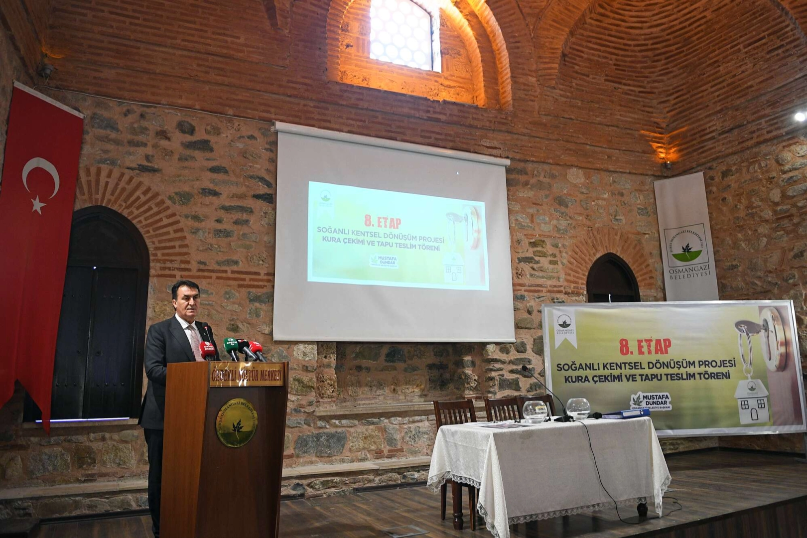 Başkan Dündar, tapu teslim töreninde yaptığı konuşmada Soğanlı’da rezerv alanda inşa edilen 7 etapta güvenli yaşamın devam ettiğini, örnek projenin 8. etabının da riskli alanda hızla yükseldiğini bildirdi. Cumhurbaşkanı Recep Tayyip Erdoğan’ın işaret ettiği zemin+5 kat planını ilk uygulayan belediye olduklarını ifade eden Başkan Dündar, “Bugüne kadar kentsel dönüşüm çalışmaları kapsamında belediye olarak 2bin 450 konut 272 adet ticari birimi modern ve sağlam bir şekilde vatandaşlarımıza kazandırdık. Osmangazi Belediyesi olarak 2009 yılından itibaren hazırladığımız imar planlarıyla yeni gelişim bölgeleri oluşturduk. Hamitler, Yunuseli, Güneştepe, Demirtaş, Panayır’da depreme dayanıklı, modern binalar inşa edildi. Buralarda yaklaşık 300 bin kişilik yeni bir şehir ortaya çıktı.” dedi.