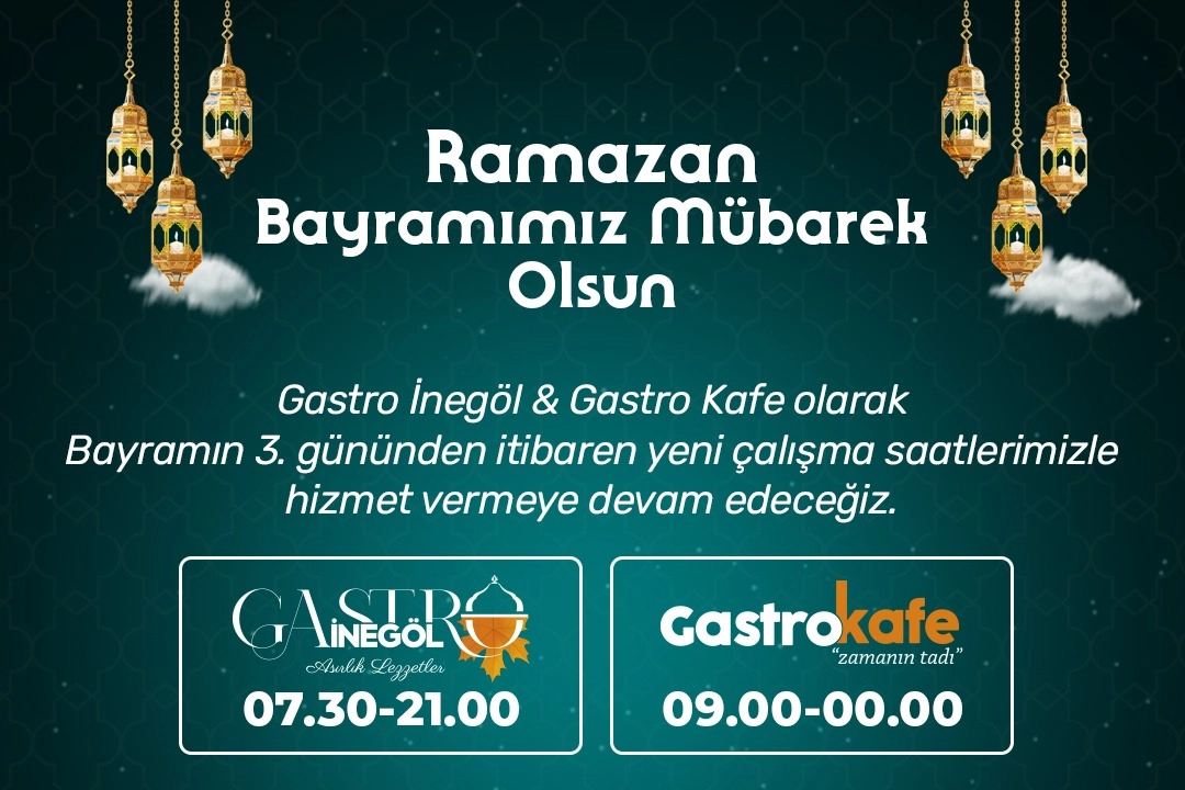Öte yandan İnegöl Belediyesi’nin sosyal tesisleri Gastro İnegöl Restoranı ve Gastro Kafenin de bayram süresince çalışma programı belli oldu. Gastro tesisleri bayramın 1’inci ve 2’nci günü kapalı olacak. Üçüncü günü ise Gastro İnegöl Restoranı sabah 07.30 ile akşam 21.00 arasında hizmet verecek. Gastro Kafe de 3’üncü günü sabah 09.00 ile akşam 00.00 arasında açık olacak. Devam eden günlerde tesisler rutin çalışmalarını sürdürecek.