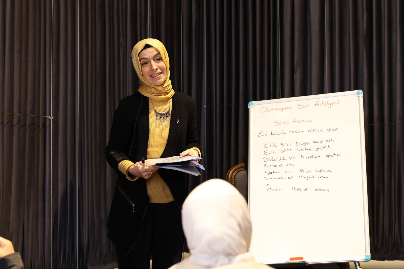 “Osmangazi Belediyesi’ne ve değerli başkanımız Erkan Aydın’a bizlere böyle bir imkan sunduğu için çok teşekkür ediyoruz. Eğitime katılanlar ilk olarak şiirin ne olduğunu, türlerini, tanımını ve temel bölümlerini öğreniyor. Ardından şiirde kullanılan vezin, ayak, uyak, kafiye ve redif gibi teknik terimleri anlamlandırıyoruz.