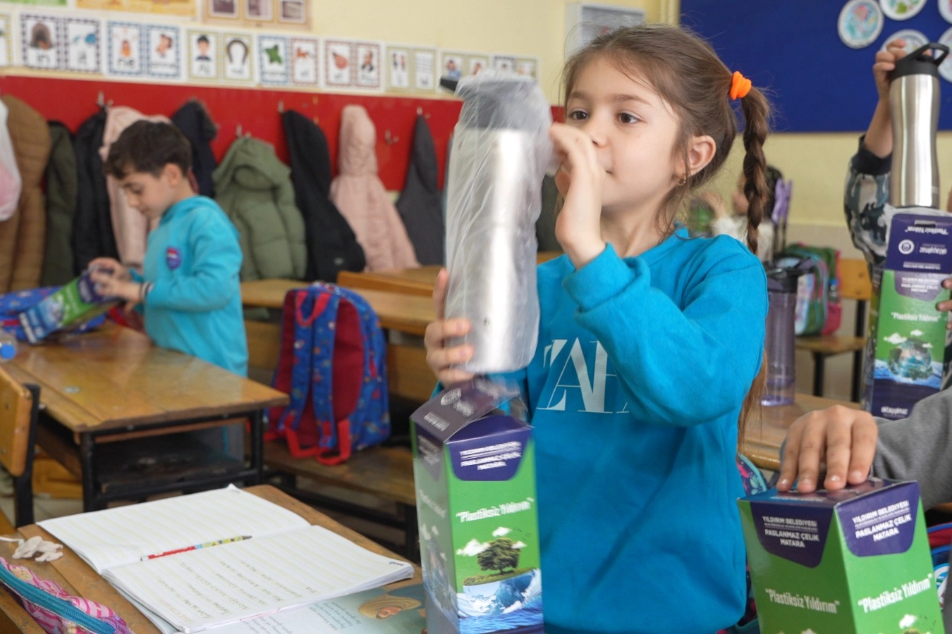 ‘Plastiksiz Yıldırım’ projesi kapsamında ilçedeki okul ve kütüphanelere arıtma sistemi kuran Yıldırım Belediyesi, öğrencilere çelik termos dağıtarak plastik şişe kullanımını en aza indirmeyi hedefliyor. Projeyle birlikte toplam 50 milyon plastik şişenin tüketiminin önüne geçilmesi amaçlanırken aynı zamanda öğrencilerin sağlıklı ve sürdürülebilir bir su tüketimi alışkanlığı kazanmaları hedefleniyor. Yıldırım Belediyesi, ‘Plastiksiz Yıldırım’ projesi kapsamında bugüne kadar 31 okula arıtma sistemi kurarken, 32 bin 842 çelik matarayı da öğrencilere dağıttı. İklim Değişikliği ve Sıfır Atık Müdürlüğü tarafından yürütülen çalışmalar ile ilçedeki tüm okullara arıtma sistemi kurulması ve tüm öğrencilere çelik matara dağıtılması hedefleniyor.