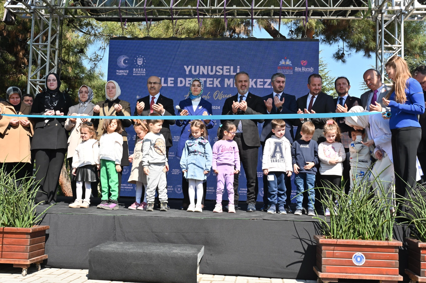 Bursa Büyükşehir Belediyesi sosyal yaşama değer katan projeleri kapsamında Osmangazi ilçesi Yunuseli mahallesine ‘Aile Destek Merkezi’ kazandırdı. 7’den 70’e tüm vatandaşlara hizmet verecek ayrıcalıklı bir alana dönüşmek için Aile Destek Merkezi projesini hazırlayan Büyükşehir Belediyesi, çalışma kapsamında iki katlı olarak toplam 1653 metrekare alan üzerine bünyesinde Ana Kucağı, BUSMEK ve BADEM hizmetlerinin verildiği modern bir merkez inşa etti. Binanın giriş katı Ana Kucağı, birinci katı ise Aile Destek Merkezi ve Busmek olarak hizmet verecek şekilde projelendirildi. Mart ayı içinde eğitime başlayan Yunuseli Ana Kucağı ücretsiz kreşinde şuan 130 öğrenci eğitim görüyor. Merkezde 6 sınıf, 1 yemekhane, 1 oyun odası ve bahçe bulunuyor. Yine merkezde yer alan Badem’de diyetisyen ve psikolog görev yapıyor. Busmek kursları için bilişim teknolojileri, giyim, el sanatları, yabancı diller ve kişisel gelişim alanlarında 460 kişiden ön başvuru alınırken, birinci katta 6 adet kurs ve atölye amaçlı çalışma sınıfı, 1 diyetisyen ve 1 psikolog odasıyla idari ofis yer alıyor. Yunuseli Aile Destek Merkezi’nin açılış törenine Büyükşehir Belediye Başkanı Alinur Aktaş ve eşi Sevinç Aktaş’ın yanı sıra Aile ve Sosyal Hizmetler Bakanı Mahinur Özdemir Göktaş, Bursa Valisi Mahmut Demirtaş, Bursa Milletvekilleri Refik Özen, Ahmet Kılıç, Emine Yavuz Gözgeç, kamu kurumu ve sivil toplum kuruluşlarının üyeleri, siyasi parti temsilcileri muhtarlar ve vatandaşlar katıldı.
