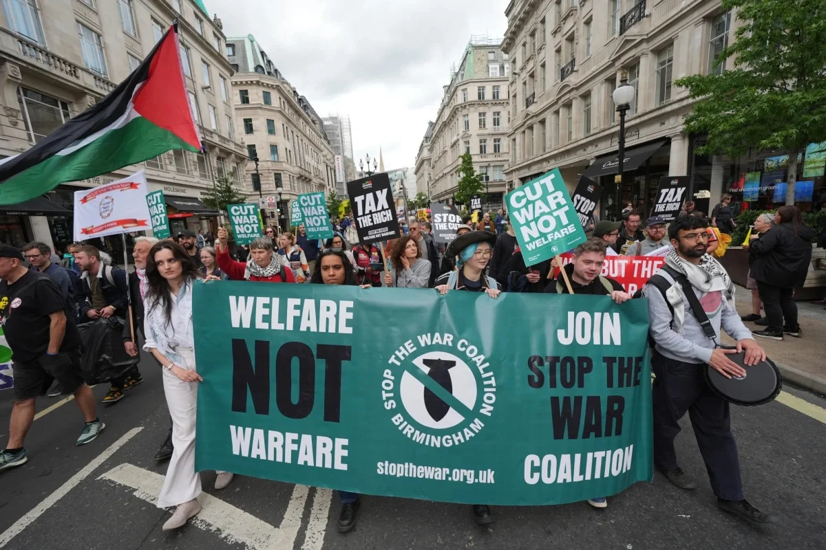 Yürüyüşe katılan protestocular, "Zengini vergilendirin, kesintileri durdurun – savaşa değil refaha bütçe", "Nükleer silah yerine hemşire", "Savaşı değil, kesintiyi kesin" gibi pankartlar taşıdı.