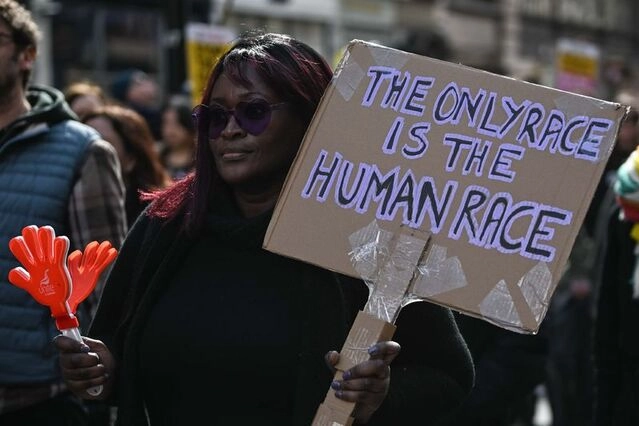 Filistin'e destek yürüyüşüne katılan göstericiler, daha sonra "Together Alliance" adlı çok sayıda sivil toplum kuruluşunun bir araya gelerek oluşturduğu ittifakın düzenlediği aşırı sağ karşıtı yürüyüşe dahil oldu.